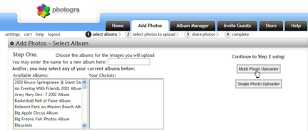 If you would like to upload multiple photos to your album, click “add photos”, select or create an album and select either the “Multi-photo uploader” which will enable you to upload up to 45 images, or to add up to four photos, please use our "Multi-pix uploader", you can find directions for this tool in our help section.