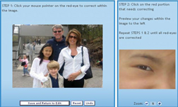 To correct red eye on your Photograph select the red eye option. With your cursor click on the eye needing correction. A new box will appear on the right of your screen displaying the eye you just selected. Click on the portion of the eye that needs correction. You may zoom in an out to view the image closer. If you make any mistakes, select “undo” to start again. Once you are done with the first eye, you may click on the other eye that needs correction, and repeat the same steps. Once you have finished the corrections, select "save edits and return". If at any time you have clicked on the eye and nothing happens, the tool has not recognized red eye, thus no correction is needed.